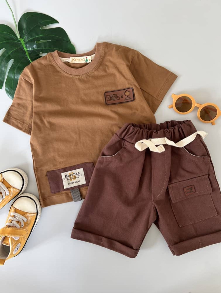 ست تیشرت شلوارک جیب دار قهوه ای تیره