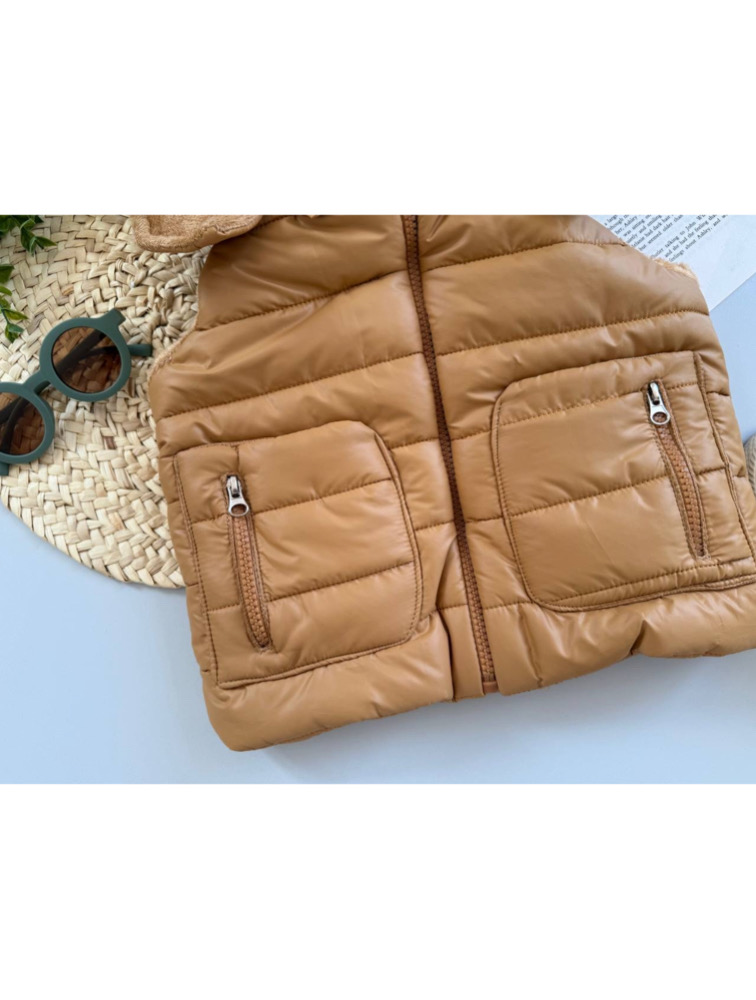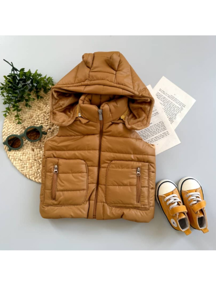 Mustard puffer with rabbit hat